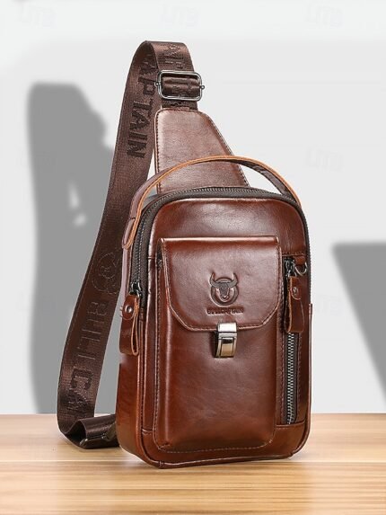 Men’s Brown Leather Crossbody Sling Bag with Multiple