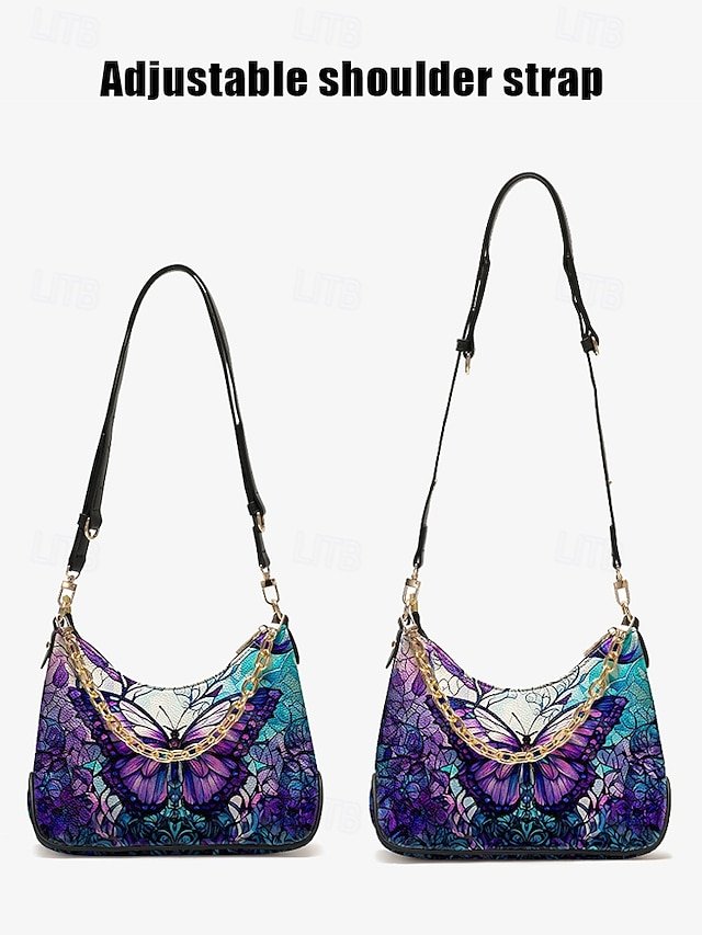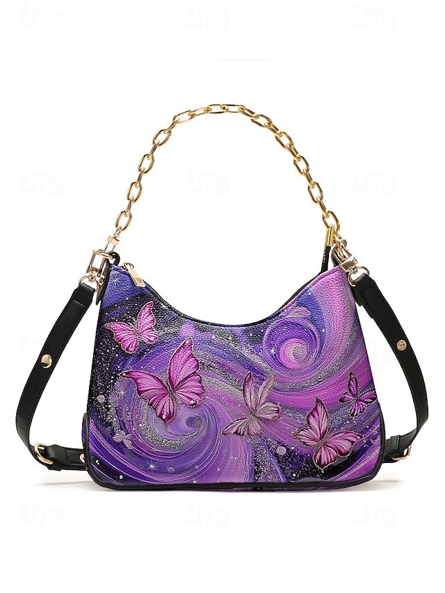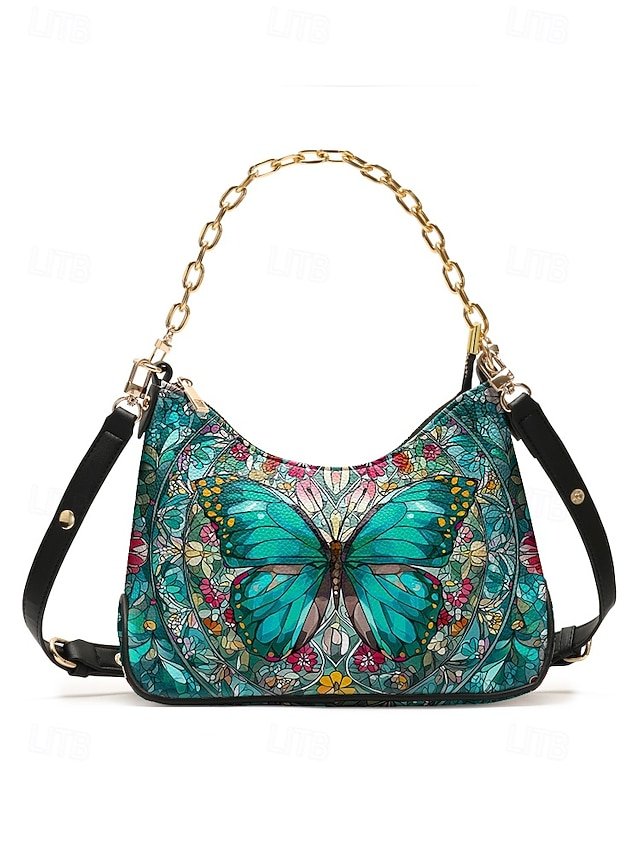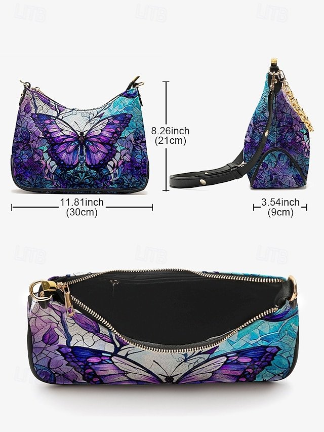 Gender: Women’s, Type: Shoulder Bags, Baguette Bag, Crossbody Bag, Material: PU Leather, Embellishment: Zipper, Chain, Print, Pattern: Butterfly, Detachable strap: Detachable, Adjustable strap: Adjustable, Occasion: Casual Daily, Valentine’s Day, Casual, Holiday, Width (cm): 9, Height (cm): 21, Length (cm): 30, Function: Waterproof, Multi Carry, Category: Handbag,